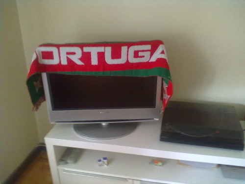 A bandeira, sempre que a Seleção joga, é colocada em cima do televisor.