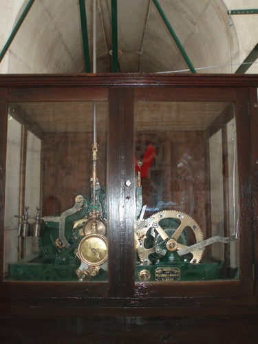 Um lance de escadas em caracol dá acesso ao espaço onde se encontra o relógio e um painel que conta os momentos da história do arco.