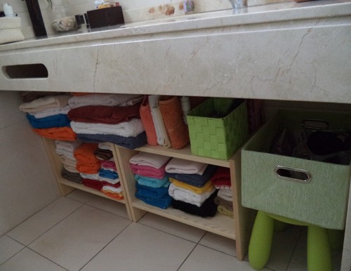 Na casa de banho, tenho, por baixo da bancada de mármore, um móvel com prateleiras e divisórias, onde estão as toalhas de rosto e de mãos.Tudo acessível para o dia-a-dia.
